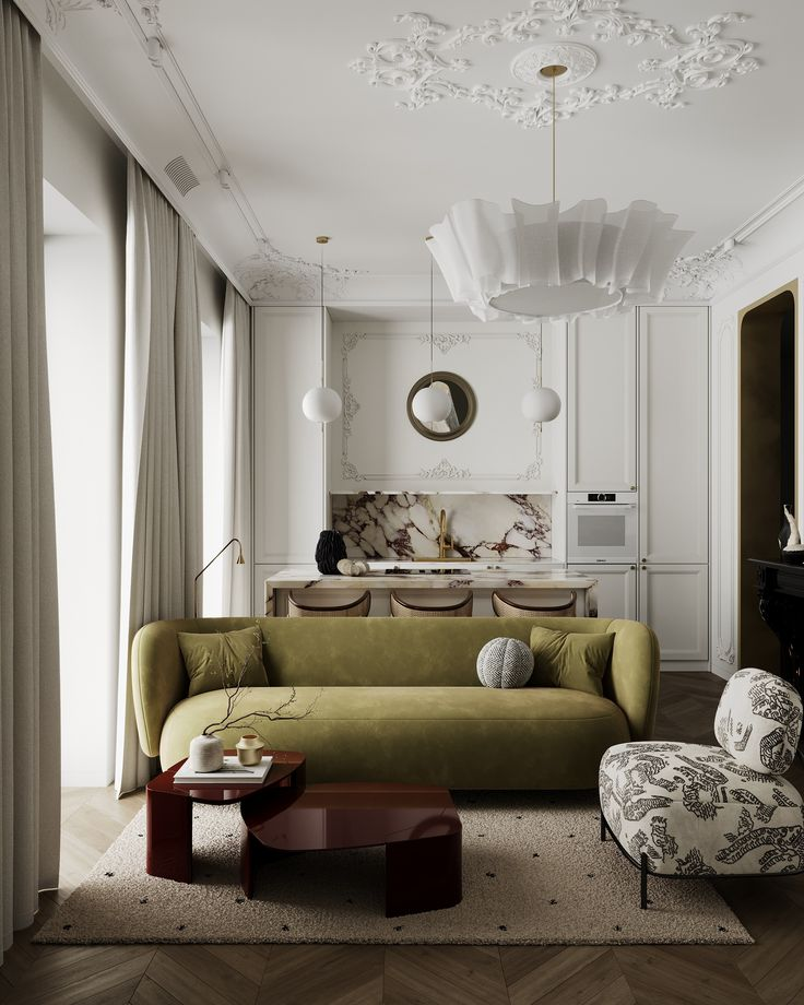 Современная классика — это классические пропорции и элементы, но без избыточного декора. Есть молдинги, но тонкие и графичные. Есть симметрия, но не строгая. Есть качественные материалы (мрамор, дерево, бархат), но без позолоты и лепнины. Есть элегантность, но без пафоса.