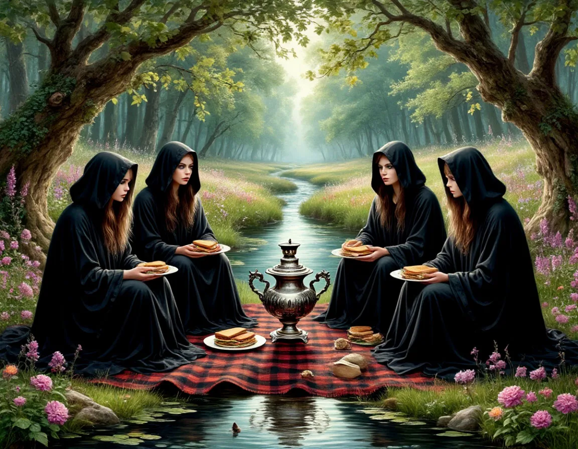 Опушка Шепчущих Ветвей была идиллическим местом. Ручей, цветы, шепчущие на ветру деревья. Идиллию портила лишь группа мрачных личностей в черных балахонах с капюшонами, сидевшая на клетчатом пледе. Перед ними стоял самовар (Олеся не поверила своим глазам) и тарелка с бутербродами. Рядом сидели три перепуганные молодые ведьмочки с повязками на глазах.