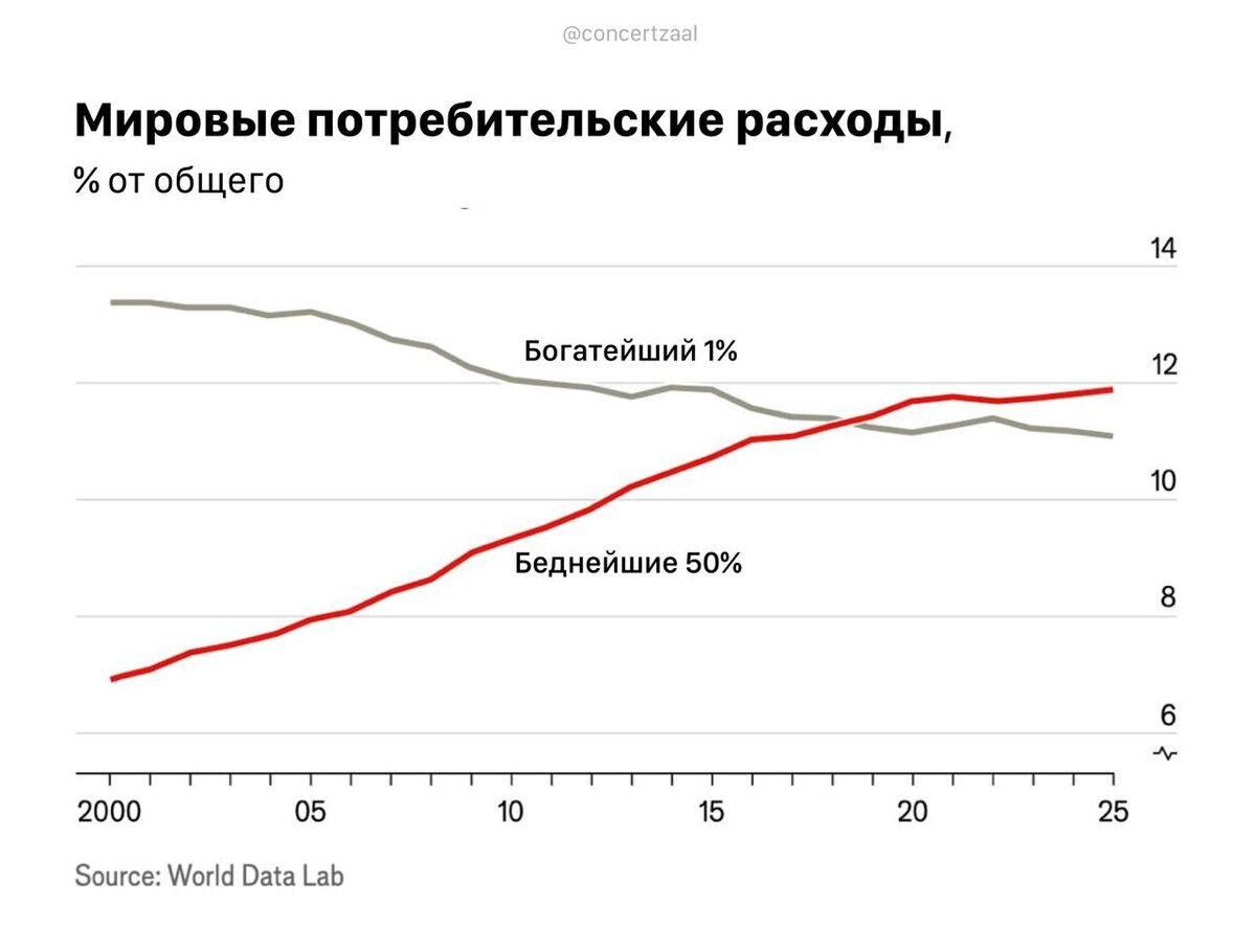 из 194 стран, включая Россию. График показывает, как доля расходов беднейших 50% населения (красная линия) постепенно увеличивается, в то время как расходы богатейшего 1% (серая линия) снижаются. В 2020-х годах эти линии практически сравнялись. В России расходы «беднейших» стали на 35% ближе к уровням самых состоятельных. Всё больше людей покупают дорогие смартфоны, посещают частные клиники и путешествуют за границу. Хотя мир всё ещё далёк от равенства, по уровню потребления различия стали заметно меньше. ❤️ ⚡️ За гранью. Подписаться
