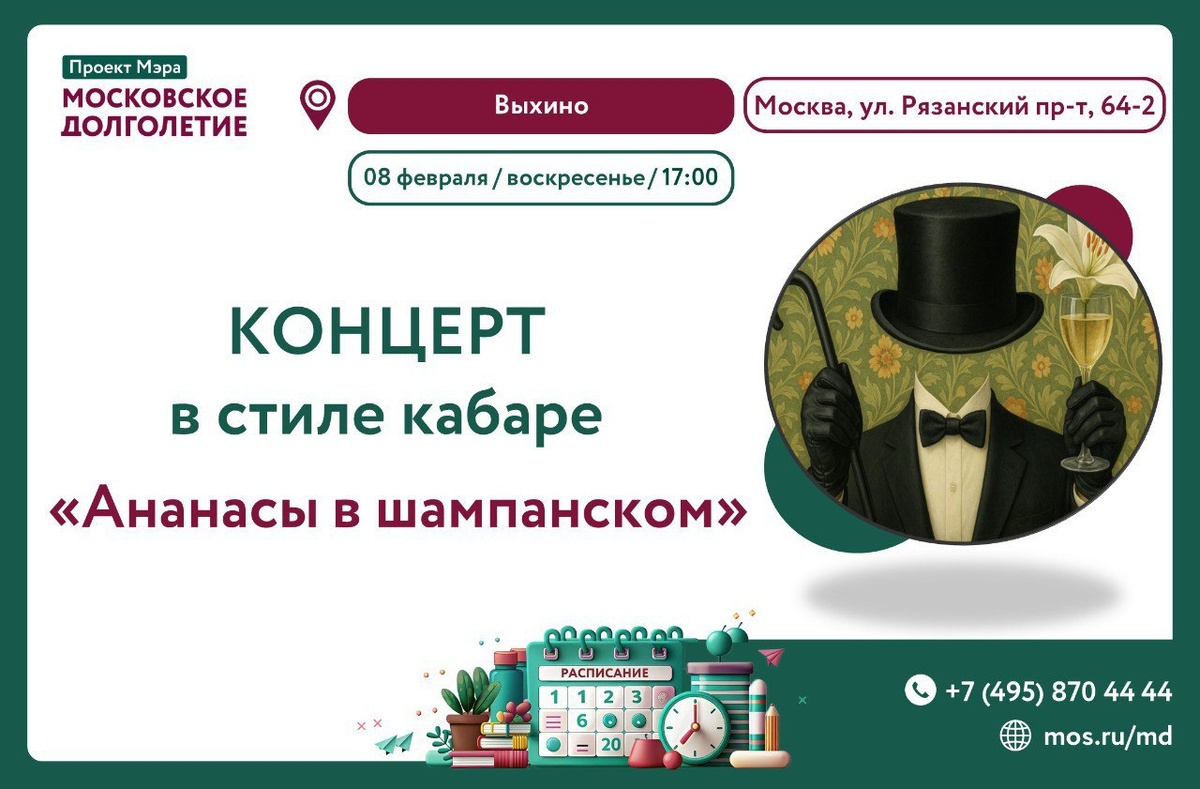 ✨Дорогие друзья! ✨ ⭐️Клуб DUENDE Светланы Карасевой, Клуб URBI ET ORBI Татьяны Ершовой приглашают на концертную программу в жанре литературно-музыкального Кабаре 🍍🍾«АНАНАСЫ В ШАМПАНСКОМ»🍍🍾 🥂Только у нас - весь артистический бомонд! Вкусно, искристо и остро!🥂 📅 Дата: 8-го февраля(воскресенье) ⏰ Время: 17:00 🏠ЦМД "Выхино": Рязанский проспект, дом 64, корпус 2 ☎️ +7 (495) 870-44-44 1. Несравненная Мадам де Флёр — Шампанский полонез (стих)