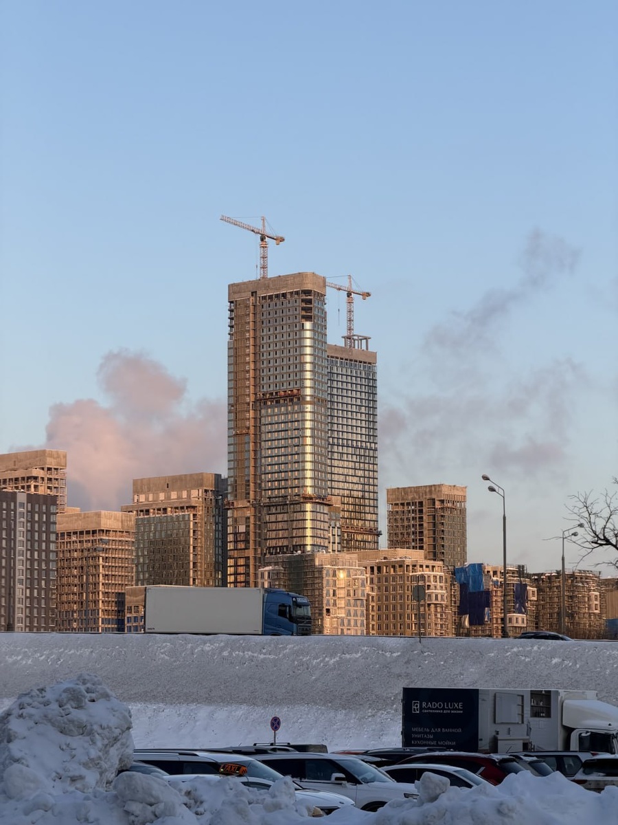 Вот так сейчас выглядит строящийся жилой комплекс «City Bay» со стороны выставочного комплекса МВЦ «Крокус Экспо».