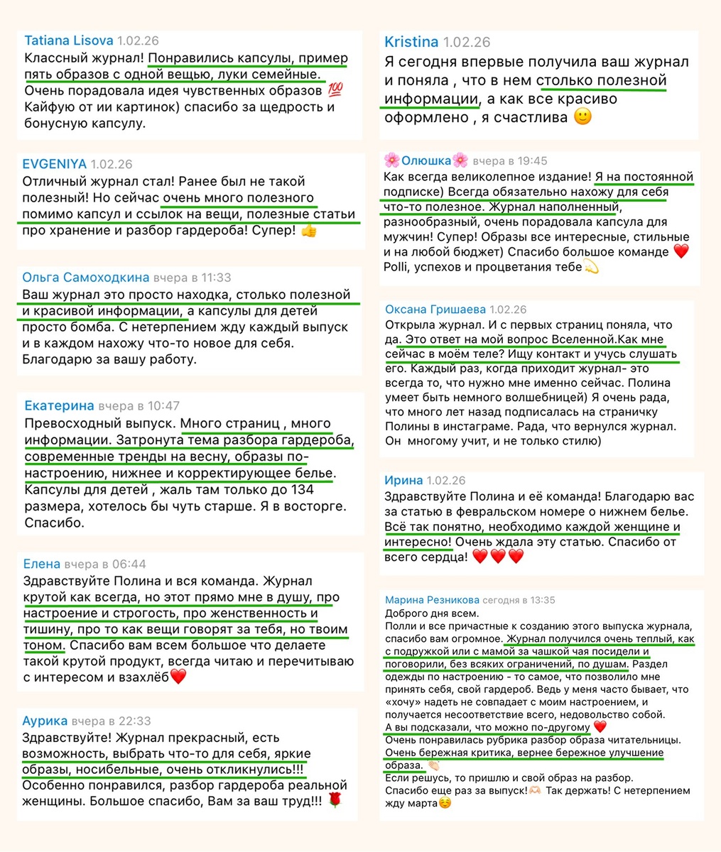 Вот несколько строк из отзывов по последнему выпуску POLLI: 💬 «Раздел одежды по настроению - то самое, что позволило мне принять себя, свой гардероб. Раньше было недовольство собой. А вы подсказали, что можно по-другому ❤️» 💬 «Журнал крутой как всегда, но этот прямо мне в душу, про настроение и строгость, про женственность и тишину, про то как вещи говорят за тебя, но твоим тоном» 💬 «Мне больше не нужно тратить время, чтобы подбирать и сочетать цвета и вещи 💫 Я в восторге!» 💬 «Журнал прекрасный, есть возможность, выбрать что-то для себя, яркие образы, носибельные, очень откликнулись!!! Особенно понравился, разбор гардероба реальной женщины» 💬 «С первых страниц поняла, что да. Это ответ на мой вопрос Вселенной. Как мне сейчас в моём теле? Ищу контакт и учусь слушать его» Каждое сообщение, которое вы нам пишете как подтверждение: стиль — это не тренд. Это отношение к себе.