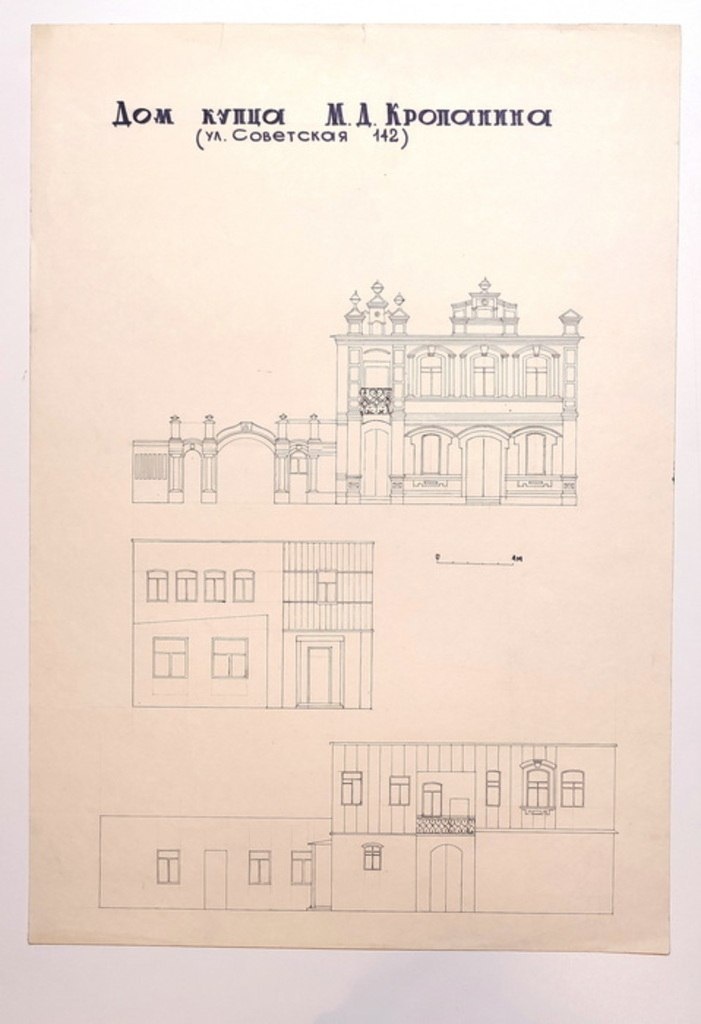 Дом купца Кропанина, ул. Советская, 142. Фасады Конец 1980-х гг. Источник: Музей архитектуры и дизайна Федерального государственного бюджетного образовательного учреждения высшего образования "Уральский государственный архитектурно-художественный университет имени Н.С. Алфёрова" https://vk.cc/cU3Wbs