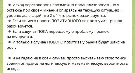 По математической вероятности исхода переговоров 2 к 1 что рынок разочаруется я пишу всю неделю. Переговоры закончились, заявлений пока нет, рынок разочаровывает просто отсутствие новостей. __________ Логика верная на 1000%