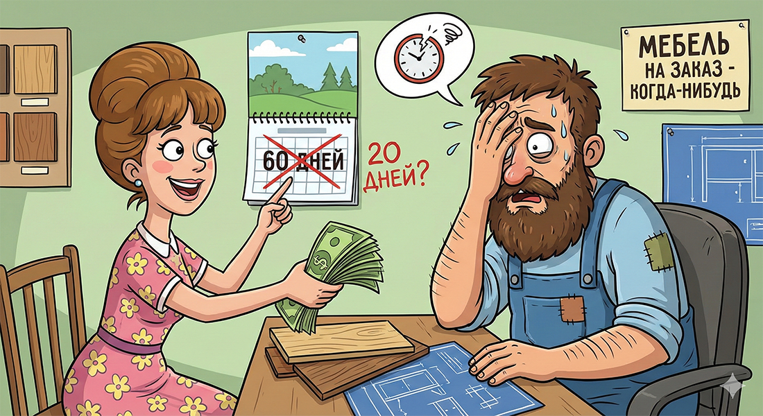 Недавно клиентка выдала гениальный лайфхак, как обмануть очередь на производство мебели. Мы сначала потеряли дар речи, а потом решили написать об этом статью. В новом посте честно (и без прикрас) рассказываем: 🕒 Почему ваша мебель может месяц лежать на складе и мы к ней не притронемся. 🛠 Что мы делаем, пока вы ждете (спойлер: не пьем кофе). 🤥 И почему конкуренты обещают сделать гардеробную за 2 недели, хотя знают, что это невозможно. Почитайте, чтобы понимать, как на самом деле работает мебельный цех: из чего на самом деле складывается срок изготовления мебели.