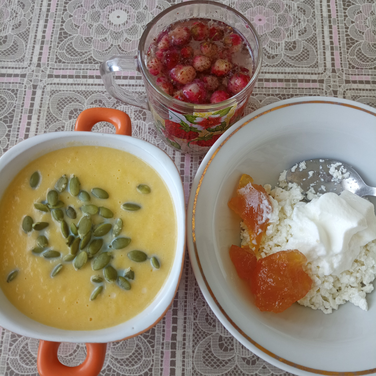 Приготовила себе на завтрак тыквенный крем - суп ( есть ещё немного тыквы в морозилке). Это не совсем правильный крем-суп. Делаю обыкновенное тыквенное пюре, в которое добавляю соль, но не простую, а адыгейскую. Разбавляю молоком до нужной консистенции и все. Мне нравится. Заварила полевую клубнику ( остатки). Ну и творог с яблочным мармеладом. Суп не доела, не рассчитала, слишком много положила. Он же сытный.