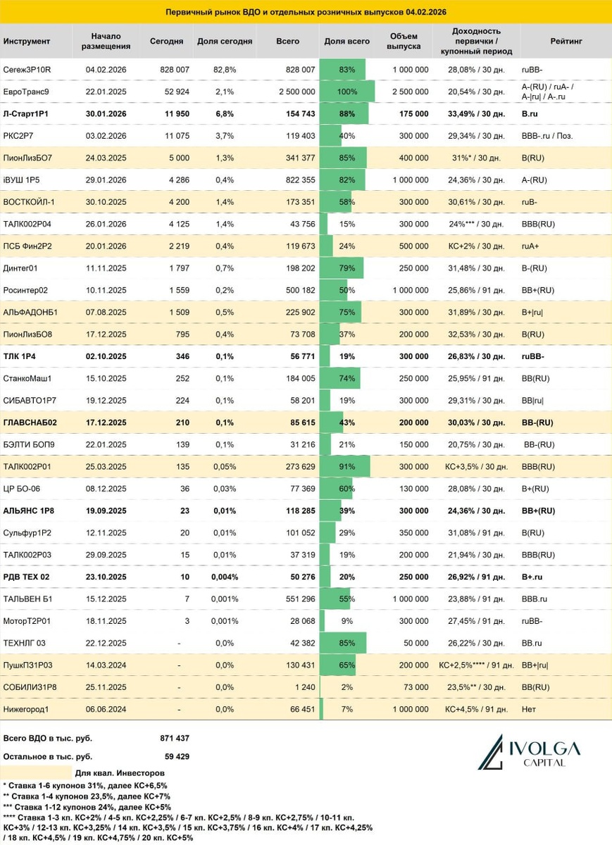 Итоги первичных размещений ВДО и некоторых розничных выпусков на 4 февраля 2026 г.