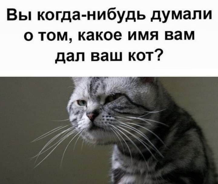 Мне кажется, мой кот зовет меня "Та, кто ворует мои какахи" или "Та, кто любит меня поймать в самый неподходящий момент и затискать" 😁