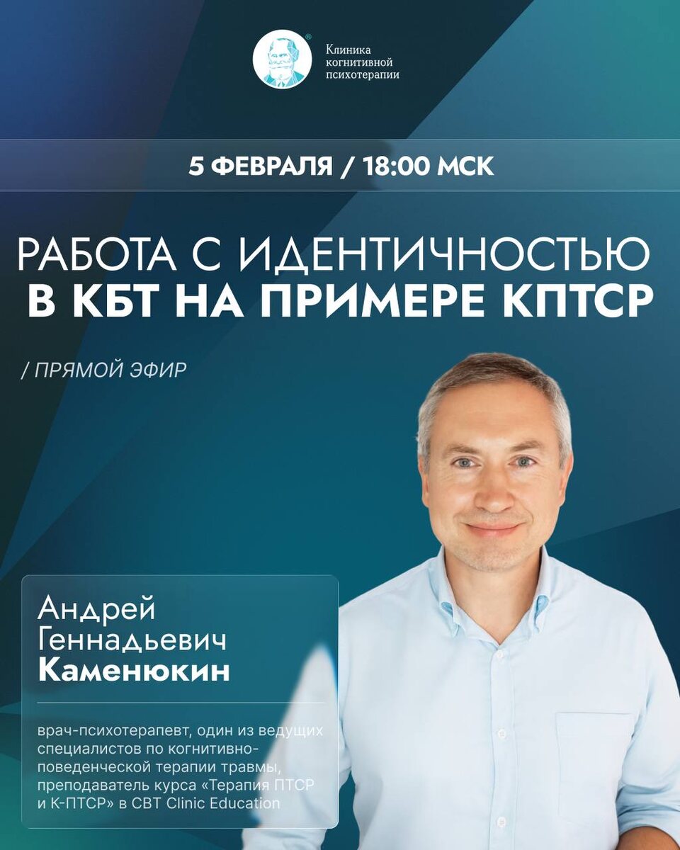 5 февраля в 18:00 🎙 Ведущий: Андрей Геннадьевич Каменюкин Тема вебинара посвящена работе с ПТСР и КПТСР и затронет один из ключевых клинических аспектов терапии травмы. При комплексном ПТСР на первый план часто выходят не просто симптомы, а глубоко укоренившееся чувство «сломленности» и негативная «я-концепция». На вебинаре мы обсудим: ✅ Специфику концептуализации идентичности при КПТСР. ✅ Отличия этой работы от классической когнитивной реструктуризации. ✅ Механизмы формирования негативных убеждений о себе после травмы. ✅ КБТ-интервенции для создания устойчивого чувства «Я». Вебинар будет полезен практикующим специалистам, которые работают или планируют работать с травматическим опытом в рамках доказательных подходов. РЕГИСТРАЦИЯ НА ОНЛАЙН-ВСТРЕЧУ До встречи на эфире! Если вы хотите начать работать с такими непростыми случаями, как ПТСР и КПТСР, вы можете пройти комплексное обучение от А.Г. Каменюкина по работе с травмой -> https://cbtclinic.education/ptsd Старт 7 февраля