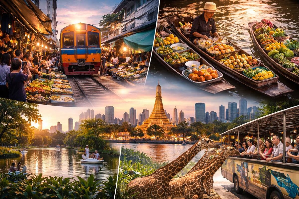 В этот раз загадка снова оказалась слишком простой 😌 Подсказки были щедрые — да, это Бангкок. Город, который умеет быть разным: хаотичным и спокойным, шумным и очень зелёным. Каждый раз можно смотреть на него по новому. Куда? Бангкок Про Бангкок слышали все. Но чаще его представляют как транзитный пункт или город «на пару дней». А что если задержаться и посмотреть на него чуть глубже — через рынки, парки и необычные места? Так мы и сделаем. Чем интересен? Бангкок — это контрасты. Здесь за одно утро можно увидеть, как поезд проходит через рынок, днём — гулять по паркам с варанами,а вечером — плыть по каналам среди деревянных домов. И при этом город остаётся удивительно живым и настоящим. Что посмотреть? 🗺Железнодорожный рынок Меклонг (Maeklong Railway Market) Тот самый рынок, где поезд проходит прямо между прилавками. Зрелище, которое сложно описать — его нужно видеть. Лучше ехать утром, когда меньше людей и больше эмоций. 🗺Плавучий рынок Лодки с фруктами, лапшой и кофе, торговля пря