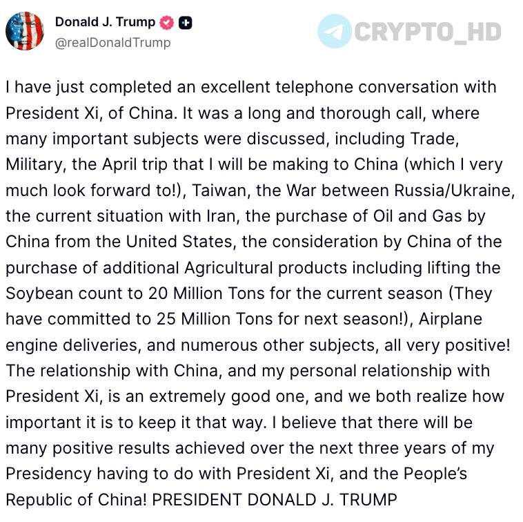 Эта была долгая и подробная беседа, в ходе которой мы обсудили много важных тем, включая торговлю, военные вопросы, мою апрельскую поездку в Китай (которую я с нетерпением жду), Тайвань, войну между Россией и Украиной, текущую ситуацию с Ираном, закупку нефти и газа Китаем у США, рассмотрение Китаем возможности закупки дополнительных сельскохозяйственных продуктов, включая увеличение объема закупок соевых бобов до 20 миллионов тонн в текущем сезоне (они обязались закупить 25 миллионов тонн в следующем сезоне!), поставки авиационных двигателей и многие другие темы, все очень позитивные! Отношения с Китаем и мои личные отношения с Си Цзиньпином являются чрезвычайно хорошими. Мы оба понимаем, насколько важно сохранить их такими. Я верю, что в течение следующих трех лет моего президентства будет достигнуто много положительных результатов, связанных с Китайской Народной Республикой! Crypto Headlines
