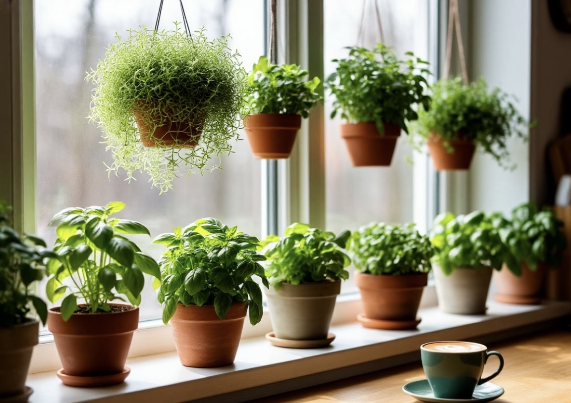- Кто подойдет: Хлорофитум, сциндапсус, пеперомия, пряные травы (если света много).