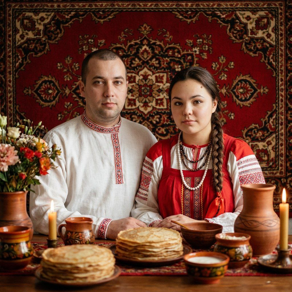 😀Выбираем "нейросети" 😀Нажимаем "Nano Banana" 😀Нажимаем "Nano Banana Pro" 😀Прикрепляем через скрепку свое фото и выбранный промпт 😀Наслаждаемся результатом😍 Фотореалистичный этнографический портрет: пара (референс)в традиционной русской народной одежде — мужчина ,не меняй черты лица в белой льняной вышиванке , девушка ,не меняй черты лица в красном сарафане и белой рубахе с вышивкой, многослойные бусы , каштановые волосы, заплетенные в русскую косу.сидят в расслабленной позе бок о бок за праздничным столом с блинами ,глиняной посудой, чашами и цветочной композицией. Фон — насыщенный красный ковёр с традиционным орнаментом, заполняющий задник кадра. Тёплое мягкое боковое освещение с свечными бликами, низкая глубина резкости и мягкое боке, богатая текстура тканей и деталей, естественные тёплые тона, лёгкая зернистость пленки для атмосферности. Композиция — полупространственный портрет по пояс, интимная, спокойная атмосфера, высокая детализация ткани, узоров и сервировки. Камерные