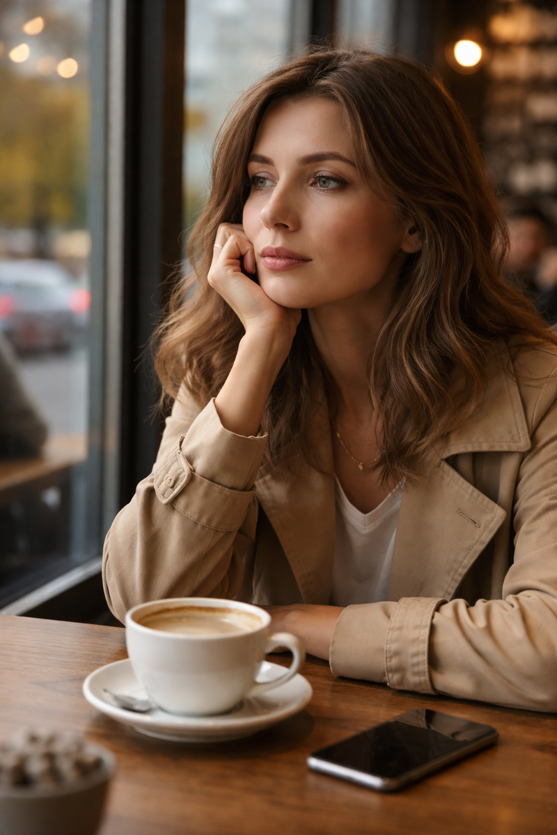 Кофейня была обычная: запах сладкого, музыка, люди. И в этой обычности было что-то нереальное. Будто наша история не имеет права случаться здесь — среди капучино и детских колясок. Она должна была остаться там, в прошлом, где всё драматично, где всё крайнее, где всё “навсегда”.