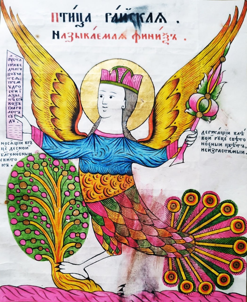 ! Птица райская, называемая Финикс. Миниатюра 1880 года. Птица феникс летает над ливанскими кедрами 500 лет, а затем отправляется в Гелиополь, где сгорает и восстает из пепла Удивительные свойства существа и ее необычная внешность (голова ее украшена венцом, а на ногах — царские сапоги) превратили ее в райскую птицу, которая стала изображаться, подобно сиренам, с верхней девичьей половиной.