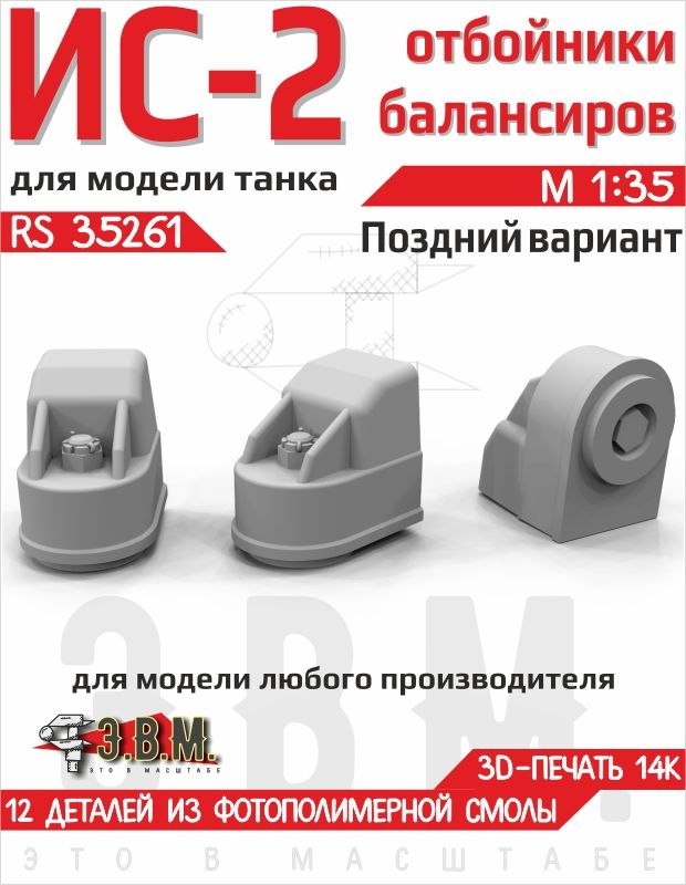 В.М. выпустили поздний вариант отбойников балансиров (с усилением) для моделей танков ИС-2 в 1/35 масштабе. Цена: 220₽ Набор универсальный, подходит для моделей танков ИС-2 любых производителей. В комплекте 12 детадей из фотополимерной смолы с высокой степенью детализации и точностью размеров. Отбойники данного типа ставились на все танки и САУ с (примерно) августа 44-го года и до конца производства, на корпуса всех заводов.