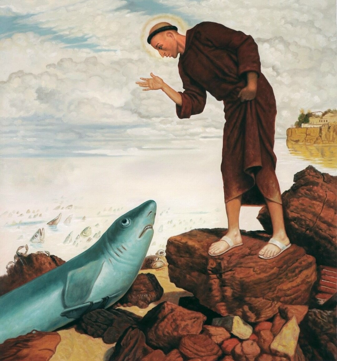 ». Картина Арнольда Бёклина, 1892 год. Согласно легенде, Антоний отправился в итальянский город Римини, чтобы направлять на путь истинный еретиков. Городские власти приказали выгнать святого. И тогда он вышел за черту города, туда, где река Мареккья впадает в Адриатическое море, и стал проповедовать рыбам. На поверхность всплыли тысячи рыб и стали слушать Антония. Увидев это чудо, жители Римини пришли к святому и попросили повторить проповедь и для них. Популярный мотив для европейских художников, эта легенда появляется на полотнах и гравюрах уже с XVI века.
