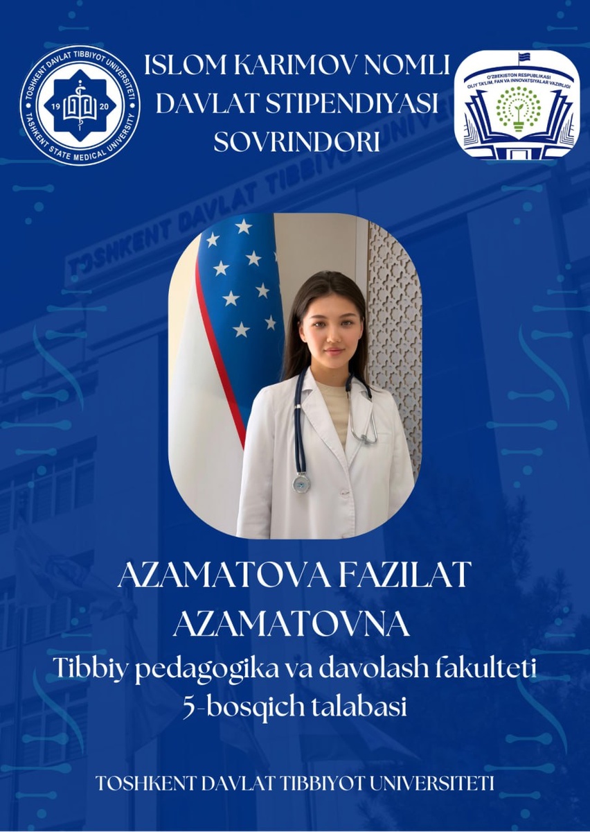 stipendiyalarini qo‘lga kiritib, universitetimiz nufuzini yana bir bor yuksak darajada namoyon etdilar. 🔺Xususan, tanlov natijalariga ko‘ra, Toshkent davlat tibbiyot universitetining 3 nafar talabalari O‘zbekiston Respublikasi Prezidentining davlat stipendiyasi, 1 nafar talabasi esa Islom Karimov nomidagi davlat stipendiyasi sohibiga aylandilar. 💠Mazkur yutuqlar talabalarning izchil mehnati, yuqori akademik salohiyati hamda professor-o‘qituvchilarning samarali ilmiy-pedagogik faoliyati natijasi ekanini yana bir bor tasdiqlaydi. Ushbu muvaffaqiyatlar universitetimizda bo‘lajak shifokor va mutaxassislar uchun bilim olish, ilmiy izlanishlar olib borish va o‘z salohiyatini to‘liq namoyon etish borasida yaratilayotgan keng imkoniyatlarning yaqqol ifodasidir. 🔺 Stipendiya sovrindorlarini ushbu yuksak e’tirof bilan samimiy tabriklaymiz hamda ularning kelgusidagi o‘qish va ilmiy faoliyatida yanada ulkan zafarlar tilaymiz! 💠Rasmiy sahifalarimiz: Telegram | Facebook | Instagram | YouTub