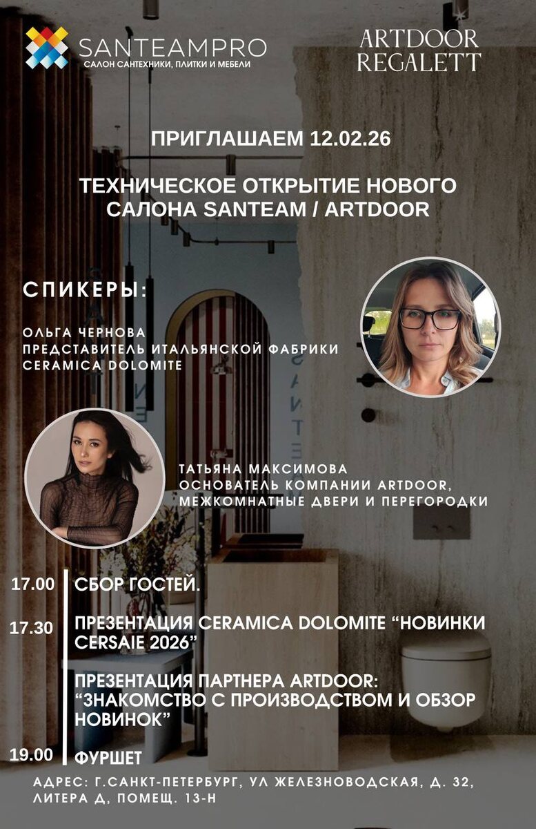 Санкт-Петербург. На открытии выступят: ✅Представитель фабрики CERAMICA DOLOMITE: «Презентация новинок бренда» ✅Основатель бренда ARTDOOR межкомнатные двери и перегородки: «Знакомство с производством и обзор новинок» 🗓 дата 12.02.2026 г. 🕓 сбор гостей в 17.00. 📍 Г.САНКТ-ПЕТЕРБУРГ, УЛ ЖЕЛЕЗНОВОДСКАЯ, Д. 32, ЛИТЕРА Д, ПОМЕЩ. 13-Н Ссылка для регистрации: http://santeam.tilda.ws/spb120226 С уважением, Полина Евнукова, основатель салона SANTEAM. Буду рада Вас видеть! P.S. Регистрация на мероприятие будет подтверждена после звонка менеджера.