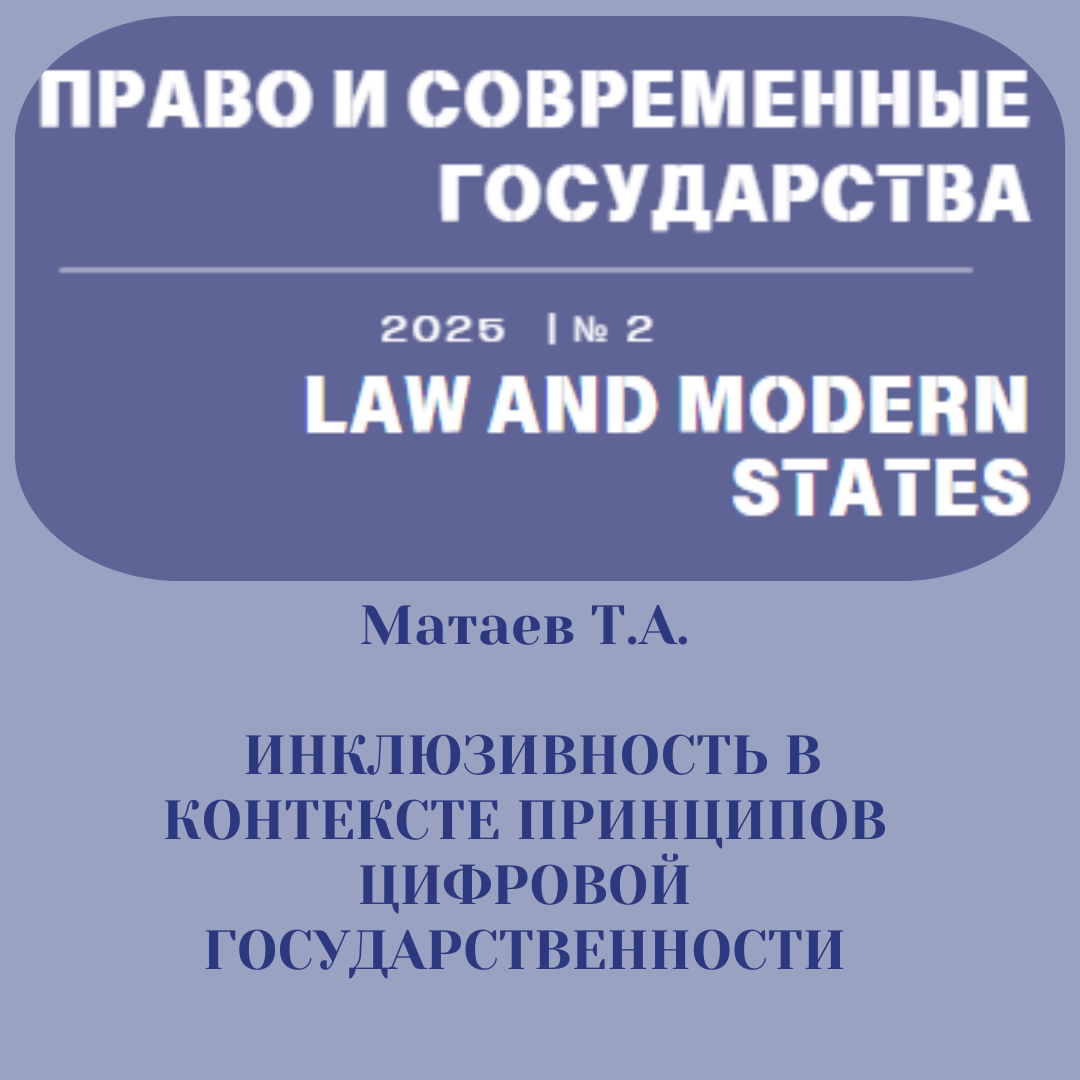 Представляем публикации 2 номера 2025 года Журнала «Право и современные государства» ИНКЛЮЗИВНОСТЬ В КОНТЕКСТЕ ПРИНЦИПОВ ЦИФРОВОЙ ГОСУДАРСТВЕННОСТИ Матаев Тимофей Александрович, курсант 3 курса Федерального казённого образовательного учреждения высшего образования «Кузбасский институт ФСИН России», email: mataev.timofey@mail.ru. Научный руководитель - Веселова Анна Петровна, начальник кафедры государственно-правовых дисциплин ФКОУ ВО Кузбасский институт ФСИН России, кандидат исторических наук. УДК 347.918 Аннотация. В статье поднят вопрос о сущностной трансформации принципов буржуазной государственности в условиях цифровизации и предложено их соответствующее понимание в реалиях цифрового государства. Сформулированы некоторые специфические принципы цифровой государственности, а также высказано мнение о том, что ведущим из них является принцип инклюзивности. Проанализированы отдельные направления инклюзии, их практическая реализация и отражение в нормативных актах, сформулирована связь с