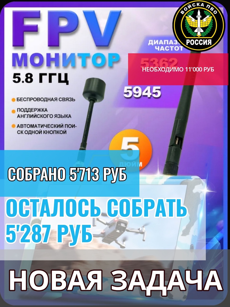 : 🖥 FPV МОНИТОР(очень необходимая штука для контроля атак) 📌Сумма к сбору - 11'000 руб. 🔺Собрано: 5'714 руб. 🔺Осталось собрать - 5'287 руб. Ребята ПВО прикрывают войска и объекты от действий средств воздушного нападения противника. Любую посильную сумму можно перевести на номер карты 💳2202208188194204 или по номеру телефона 📞+79530562233 Получатель - Светлана Владимировна Л. ("Сбербанк") #уралсвоихнебросает #вместемысила