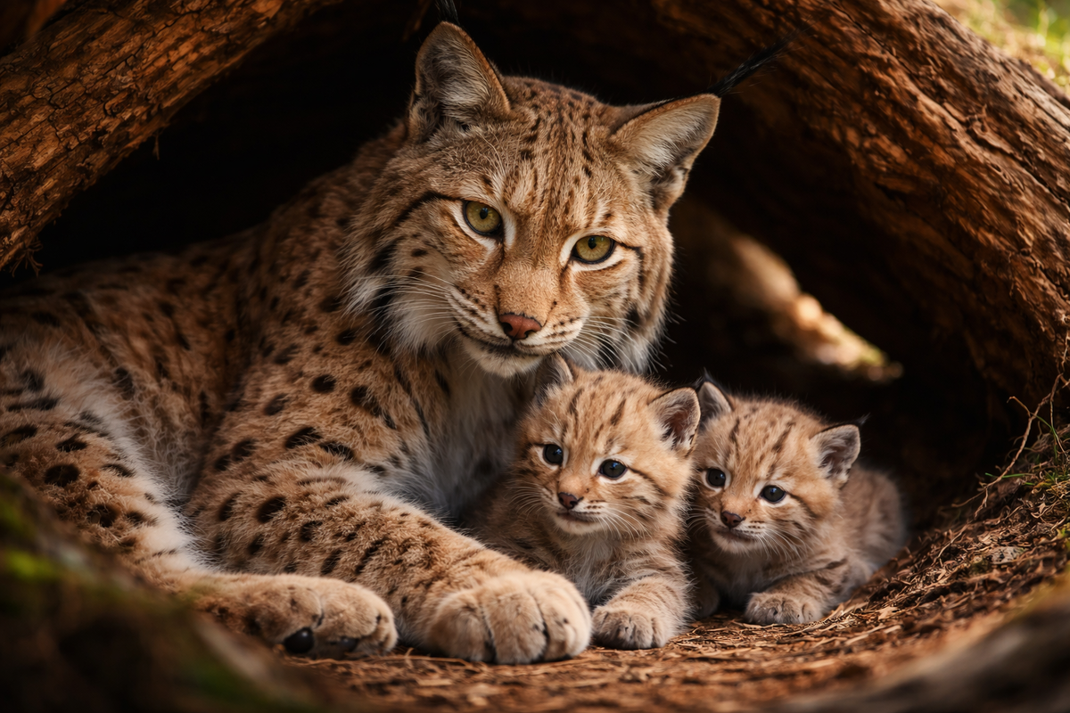 Эта охотница была рысь. Красивая пятнистая кошка с длинными кисточками на ушах и коротким хвостом. И всё же ей удалось в этом году выносить и родить двух котят. Маленькие пушистые комочки лежали у неё в норе, которую она соорудила внутри бревна упавшего дерева. Они грели ей душу. Она уж и не рассчитывала стать матерью ещё раз. Ради этих малышей рысь готова была на всё. Она могла забыть все самые древние правила и глубинные инстинкты.
