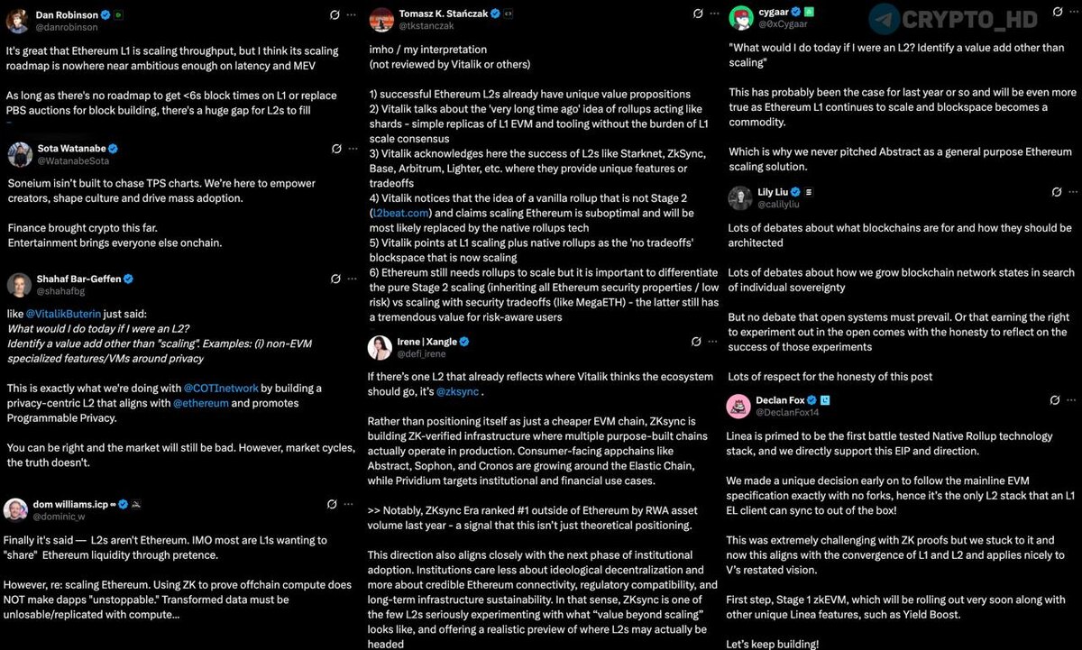 🤔 L2-блокчейны теряют актуальность. Реакции топов криптоиндустрии на недавний пост Виталика Бутерина о L2-блокчейнах (часть 2) Читать: 1 часть ➠ Dom Williams (Internet Computer): - Наконец-то сказано прямо – L2 это не Ethereum. - По факту большинство L2 — это отдельные L1, которые хотят «прикарманить» ликвидность Ethereum через имитацию связи. - Одни только ZK-доказательства НЕ делают dApps «неостановимыми» – данные все равно должны где-то храниться и быть доступными. ➠ Dan Robinson (Paradigm): - Наращивание пропускной способности Ethereum L1 – это здорово, но по скорости и проблеме MEV амбиций маловато. - Пока нет внятного плана для создания блоков быстрее 6 секунд на L1 или замены PBS-аукционов, то у L2 сохраняется огромная ниша для работы. ➠ Lily Liu (Solana Foundation): - Много споров об архитектуре блокчейнов и их целях, но никто не спорит, что открытые системы должны победить. Огромное уважение за откровенность этого поста. ➠ Tomasz Stanczak (разработчик Ethereum): - Успеш