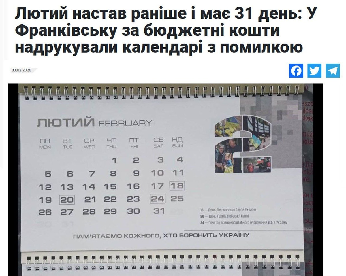 Администрация Ивано-Франковска потратила бюджетные деньги на календари, в которых в феврале 31 день