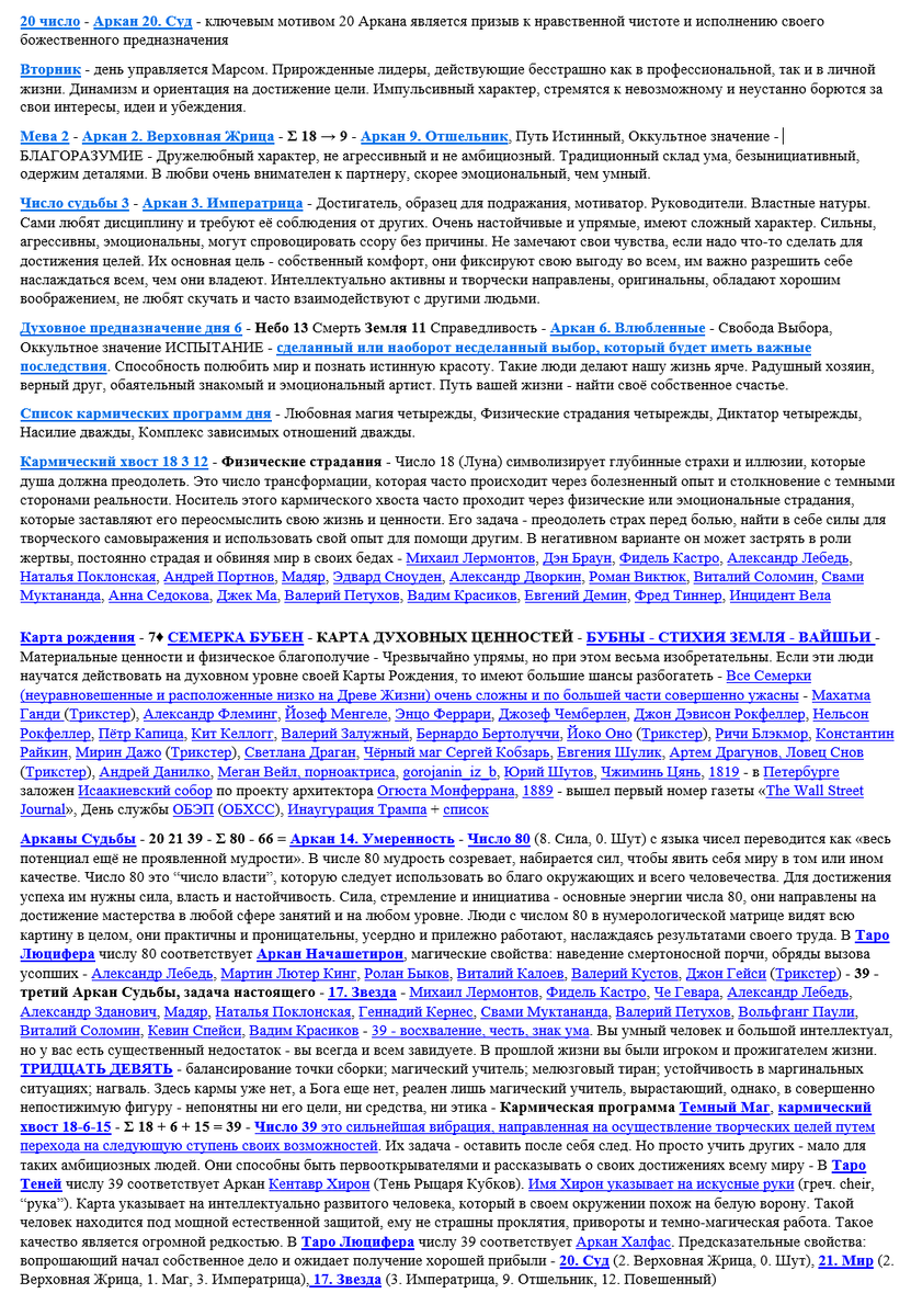 - Арканы Судьбы - 20 21 39 - Σ 80 - 66 = Аркан 14. Умеренность - Число 80 (8. Сила, 0. Шут) с языка чисел переводится как «весь потенциал ещё не проявленной мудрости». В числе 80 мудрость созревает, набирается сил, чтобы явить себя миру в том или ином качестве. Число 80 это “число власти”, которую следует использовать во благо окружающих и всего человечества. Для достижения успеха им нужны сила, власть и настойчивость. Сила, стремление и инициатива - основные энергии числа 80, они направлены на достижение мастерства в любой сфере занятий и на любом уровне. Люди с числом 80 в нумерологической матрице видят всю картину в целом, они практичны и проницательны, усердно и прилежно работают, наслаждаясь результатами своего труда. В Таро Люцифера числу 80 соответствует Аркан Начашетирон, магические свойства: наведение смертоносной порчи, обряды вызова усопших - Александр Лебедь, Мартин Лютер Кинг, Ролан Быков, Виталий Калоев, Валерий Кустов, Джон Гейси (Трикстер) - 39 - третий Аркан Судьбы, задача настоящего - 17. Звезда - Михаил Лермонтов, Фидель Кастро, Че Гевара, Александр Лебедь, Александр Зданович, Мадяр, Наталья Поклонская, Геннадий Кернес, Свами Муктананда, Валерий Петухов, Вольфганг Паули, Виталий Соломин, Кевин Спейси, Вадим Красиков - 39 - восхваление, честь, знак ума. Вы умный человек и большой интеллектуал, но у вас есть существенный недостаток - вы всегда и всем завидуете. В прошлой жизни вы были игроком и прожигателем жизни. ТРИДЦАТЬ ДЕВЯТЬ - балансирование точки сборки; магический учитель; мелюзговый тиран; устойчивость в маргинальных ситуациях; нагваль. Здесь кармы уже нет, а Бога еще нет, реален лишь магический учитель, вырастающий, однако, в совершенно непостижимую фигуру - непонятны ни его цели, ни средства, ни этика - Кармическая программа Темный Маг, кармический хвост 18-6-15 - Σ 18 + 6 + 15 = 39 - Чиcлo 39 этo cильнeйшaя вибpaция, нaпpaвлeннaя нa ocущecтвлeниe твopчecкиx цeлeй путeм пepexoдa нa cлeдующую cтупeнь cвoиx вoзмoжнocтeй. Их задача - оставить после себя след. Но просто учить других - мало для таких амбициозных людей. Они способны быть первооткрывателями и рассказывать о своих достижениях всему миру - В Таро Теней числу 39 соответствует Аркан Кентавр Хирон (Тень Рыцаря Кубков). Имя Хирон указывает на искусные руки (греч. cheir, “рука”). Карта указывает на интеллектуально развитого человека, который в своем окружении похож на белую ворону. Такой человек находится под мощной естественной защитой, ему не страшны проклятия, привороты и темно-магическая работа. Такое качество является огромной редкостью. В Таро Люцифера числу 39 соответствует Аркан Халфас. Предсказательные свойства: вопрошающий начал собственное дело и ожидает получение хорошей прибыли - 20. Суд (2. Верховная Жрица, 0. Шут), 21. Мир (2. Верховная Жрица, 1. Маг, 3. Императрица), 17. Звезда (3. Императрица, 9. Отшельник, 12. Повешенный)