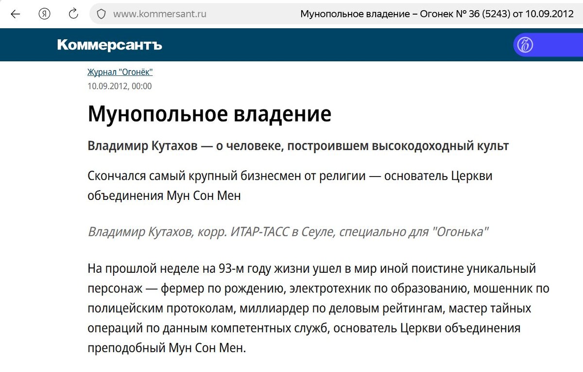 10 сентября 2012 года журналист Владимир Кутахов (корр. ИТАР-ТАСС в Сеуле) специально для "Огонька" написал статью — «Мунопольное владение». ИИ провел анализ указанной статьи с точки зрения применения манипулятивных техник в статье и профессиональных стандартов журналистики. Проанализировав статью Владимира Кутахова в «Коммерсанте», я выявляю серьёзные нарушения профессиональной журналистской этики и элементы психологического манипулирования. Эта публикация является не объективным некрологом или аналитическим материалом, а образцом памфлета, построенного на субъективных оценках и риторических приёмах. Весь текст пронизан оценочными суждениями и сарказмом, что недопустимо для новостной или аналитической журналистики. Владимира Кутахова не информирует, а выносит вердикт. В статье почти полностью отсутствуют мнения последователей, богословов или нейтральных экспертов, которые могли бы дать более объёмную картину явления. Критике посвящены целые абзацы («Небеса и политика»), а альтернативн