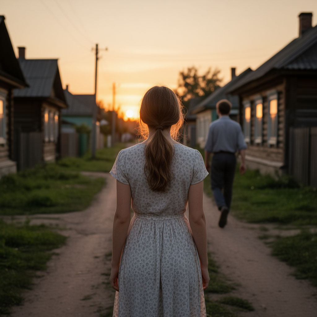 Вечерняя тропинка уводила их всё дальше от шумной танцплощадки. Сверчки заливались в траве, создавая фон для их молчания. Зина шла, нервно перебирая складки юбки.