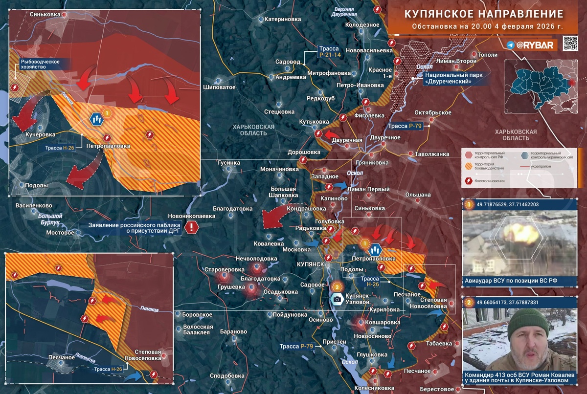 Купянское направление по-прежнему остаётся одним из наиболее проблемных. По переправам через Оскол, по которым противник систематически перебрасывает подкрепления на восточный берег, столь же систематически работают российские операторы дронов и авиация. Обстановка в самом Купянске остаётся по-прежнему сложной. 🔸Несколько дней назад из Купянска-Узлового вновь появились кадры с тем же украинским офицером, который рядом со зданием почты в центре населённого пункта демонстрировал двух пленных бойцов ВС РФ. 🔸При этом на восточном берегу есть успехи, однако они серьёзно омрачены последствиями «антикризов». В Петропавловке, которая стала одним из немногих мест, где часть населённого пункта, ранее занятого «в кредит», действительно перешла под контроль ВС РФ, после демонстрации присутствия по позициям ВС РФ был нанесен авиаудар. ❗️Это не единственные проблемы, вызванные новыми «антикризами». От групп просачивания, находящихся в населённых пунктах с весьма шатким контролем, требуется подтвер