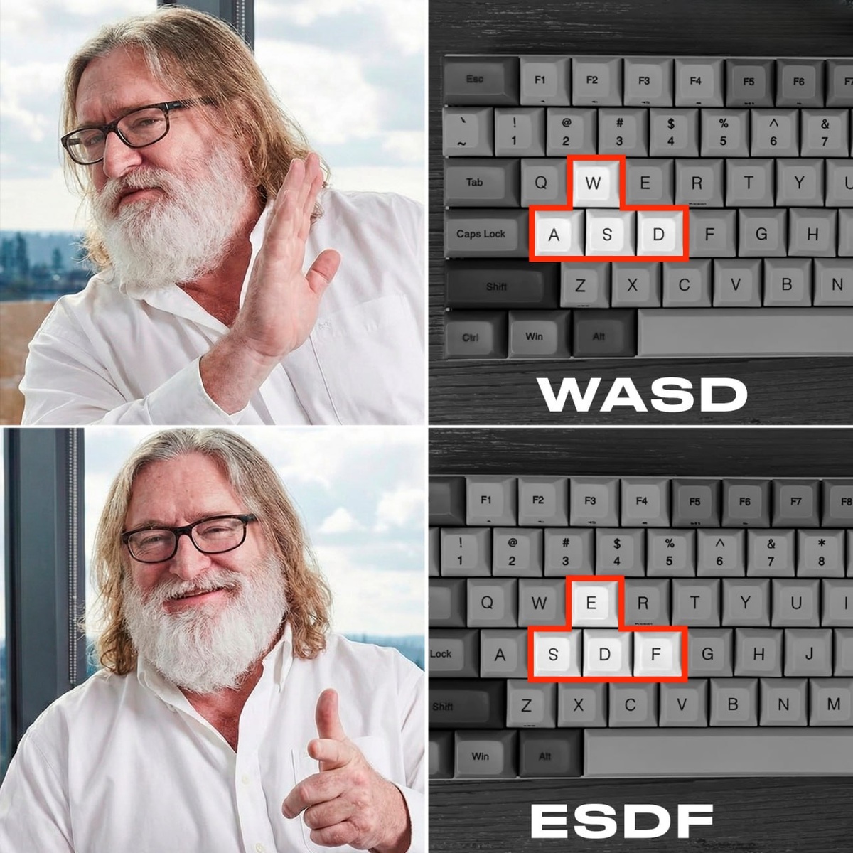 В отличие от WASD-шников, Гейб ребиндит клавиши. Логично для тех, кто много печатает.