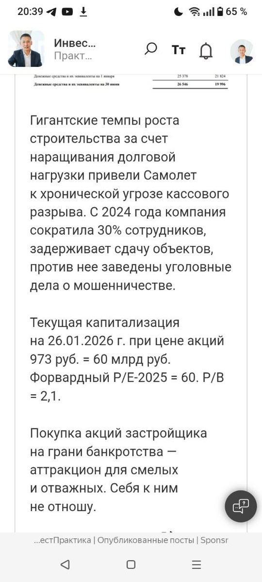 ⚡️26 января в "ИнвестПрактике" я опубликовал разбор крупнейшего застройщика России "Самолет" с подзаголовком "Долговое пике