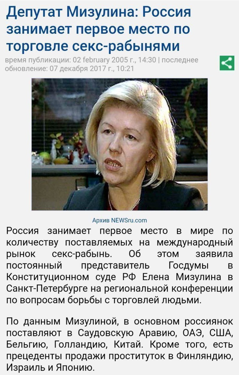 секс-рабынями!!! Мизулина старшая это не какая-то там баба депутат, она доктор юридических наук, профессор. В том же 2005 году написала монографию на 590 страниц на ту же тему!!! Потом она занималась изменением уголовного кодекса по этой теме. Ответственность тогда усилили серьезно! А после этого лет 10 не давали усилить ответственность для педофилов... Только в 2012 она смогла пробить! И закон приняли. Но не целиком... У нас например до сих пор есть УДО для педофилов. А в думе до сих пор сидят те, кто был тогда против усиления мер и ответственности. "Поздняков" Сальное Дифлопэ