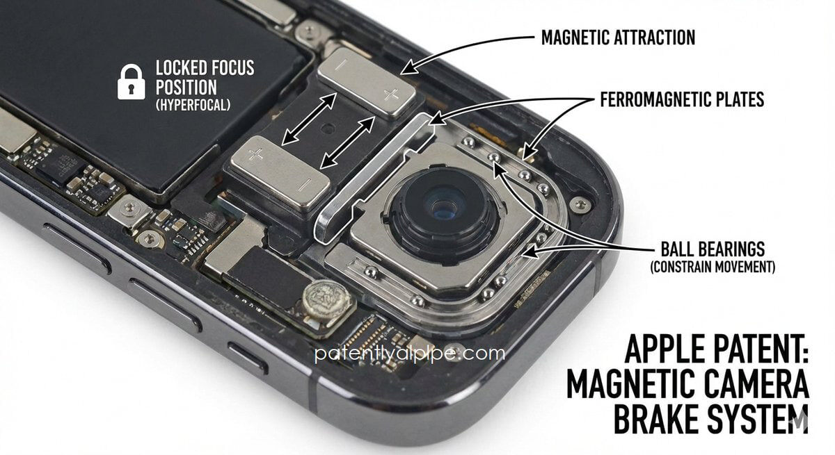 Apple получила патент на магнитную тормозную систему для камеры смартфона, которая удерживает механизм фокусировки в заданном положении даже при сильных ускорениях, вибрациях или ударах. Об этом сообщает Patently Apple. Разработка решает давнюю проблему мобильных систем автофокуса: при высокочастотных вибрациях или внезапных толчках они могут дрейфовать, терять калибровку или просто размазывать картинку. Особенно актуально это становится для съемки с велосипеда, дрона или через окно движущегося автомобиля — словом, везде, где iPhone переживает не самые спокойные моменты своей жизни. В патенте описана камера, где сенсор или линзы удерживаются в нужном положении с помощью магнитного притяжения или отталкивания. Сила магнитов рассчитана так, чтобы противостоять ускорению примерно в 10 g — это гораздо больше, чем испытывает телефон при обычном использовании. Подшипники ограничивают движение по пяти осям, предотвращая раскачивание или наклон. Когда нужна макросъемка, активируется актуатор