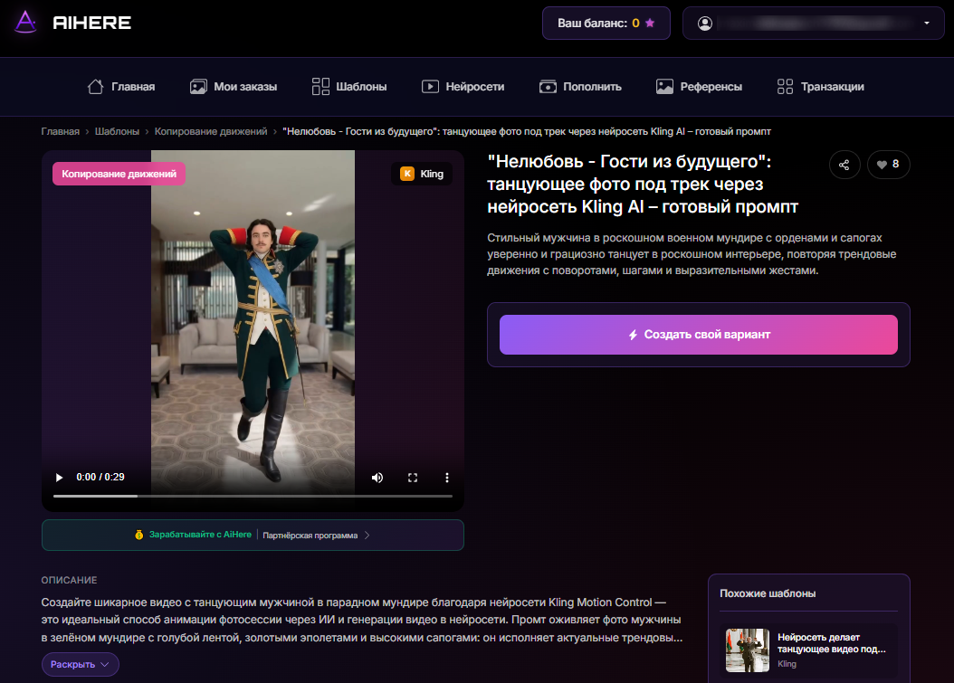 Дети, вы хотите помочь своим родителям, которые уже в возрасте, отплясать танец под Нелюбовь? Многие ребята как раз ищут, как сделать танец Нелюбовь с родителями, чтобы удивить семью или просто повеселиться вместе. Забудьте про неловкие репетиции - нейросети для видео все сделают за вас. Главный помощник здесь сервис AIHere с готовыми шаблонами под эту песню. Все по полочкам, даже если вы новичок. Покажите родителям результат - они обалдеют! Готово, теперь можно делиться в соцсетях. Вам знакомо: мама или папа стесняются двигаться, а вы горите идеей танца Нелюбовь с родителями. AIHere решает проблему моментально - берет фото и превращает в крутое видео. Основа - модель Kling 2.6, которая копирует все па с видео и накладывает на фигуру родителей. Никаких усилий, только радость. Kling 2.6 анализирует эталонное видео с танцем под Нелюбовь: каждый шаг, взмах рукой, поворот. Потом берет ваше фото родителей, подгоняет тело и лицо под ритм, сохраняя естественность. Получается плавное видео бе