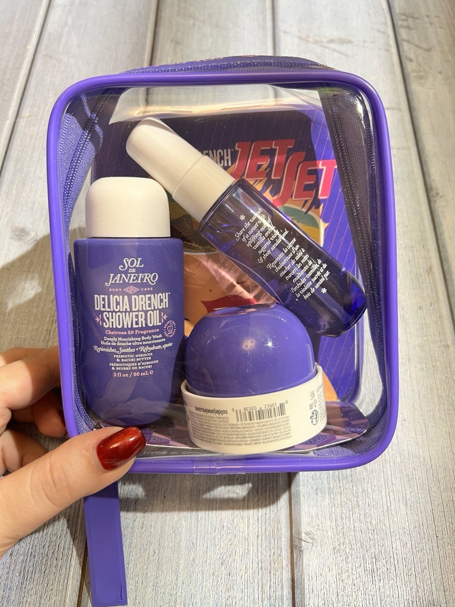 ! Sol de Janeiro Delícia Drench Jet Set 🟠Стоимость 3500р Описание Погрузитесь в чувственное путешествие в тёплые края с Delícia Drench Jet Set. Это трио, идеально подходящее для путешествий, наполнено тёплыми, сладкими и древесными нотами, которые привнесут дух бразильского заката в ваши ежедневные ритуалы. Состав набора: Масло для тела Delicia Drench 50 мл. Взбитое масло для тела увлажняет и питает кожу благодаря смеси гиалуроновой кислоты, масла бакури и гибискуса, которые смягчают кожу и надолго сохраняют влагу. Аромат гурманский, сплетённый из тёплой амбры, сахарной фиалки и ванильной орхидеи, оставляя неотразимый шлейф. Парфюм-спрей Cheirosa 59 30 мл. Поднимите настроение на новый уровень с этим бодрящим спреем, сочетающим в себе ноты сладкой ванильной орхидеи, сахарной фиалки и нежного сандалового дерева. Идеально подходит для кожи и волос, передавая дух тропического заката. Масло для душа Delicia Drench 90 мл. Гель для душа с текстурой масла и молочка разработан для интенс