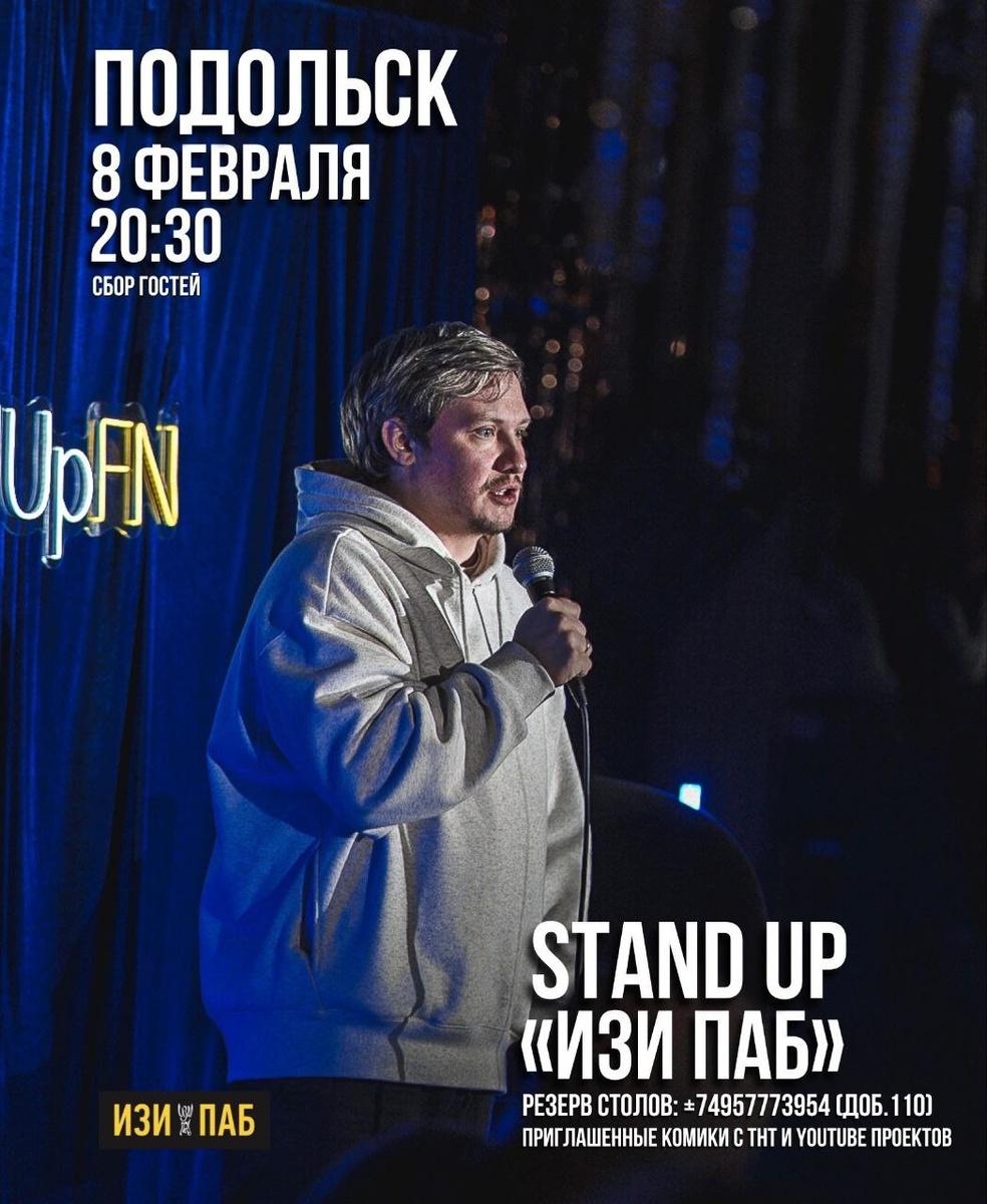 ✨ Что вы делаете в воскресенье? Мы идем на стенд ап! 8 февраля в 20:30 в Подольске состоится стенд ап😍 Комики с тнт, tv, YouTube прямо у нас в «Изи Паб» 😎 ❗Это нельзя пропустить❗ 👉Подробности: http://www.StandUpFN.ru 🚫 Возраст: 18+ 📆 08.02.2026 🕒 20:30 🏢 Бар Изи паб 📍 г. Подольск, Революционный просп., 49/107 ✅ Мероприятия Подольск https://dzen.ru/id/66ed500f7b5671493eca3fd6 http://vk.com/podolsk_events http://dzen.ru/podolsk_events