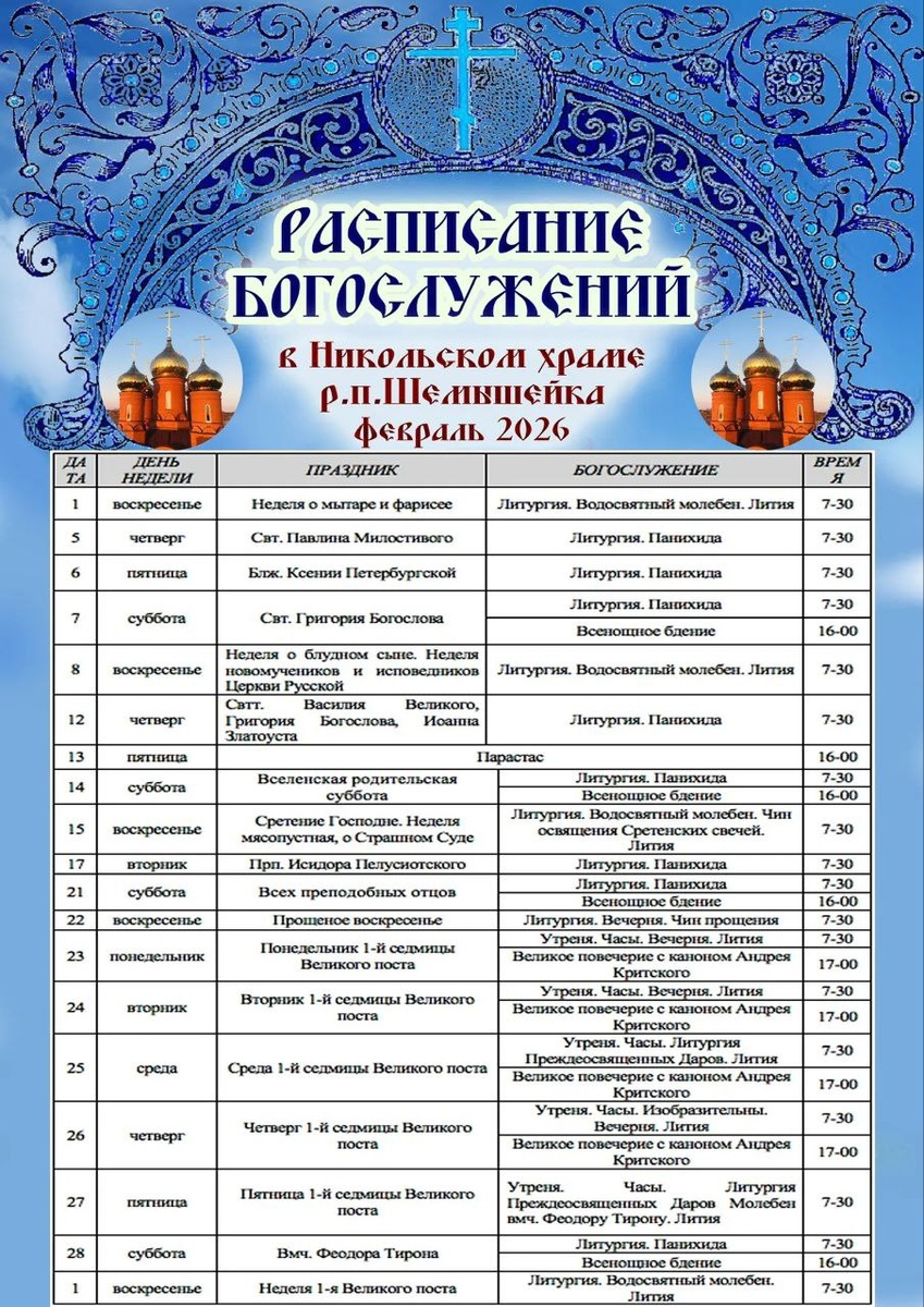 Расписание богослужений в Никольском храме р. п. Шемышейка в феврале 2026 года