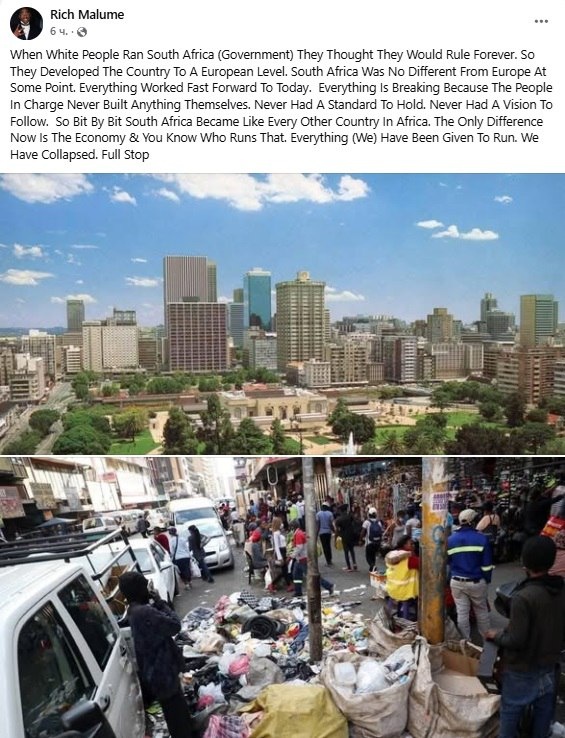 ч. моих мыслей о том, что апартеид даже среди чёрных далеко не всегда воспринимается как однозначное зло. Как минимум потому что "раздельное развитие" хотя и было в значительной степени дискриминационным, но также защищало базовые права небелых и поддерживало их стандарт жизни в такой мере, в какой современная "свободная ЮАР" просто неспособна, потому что никто никому и ничего не должен. Вот, например, откровение популярного чернокожего писателя и блогера (свыше 743 тыс. подписчиков только лишь в запрещённом в России FB) Рича Малуме: "Когда белые люди управляли Южной Африкой (правительством), они думали, что будут править вечно. Поэтому они развили страну до европейского уровня. Южная Африка в какой-то момент ничем не отличалась от Европы. Всё работало как часы, но сегодня всё рушится, потому что люди у власти ничего не построили сами. У них никогда не было стандартов, которым можно было бы соответствовать. У них никогда не было видения, которому можно было бы следовать. Поэтому пост