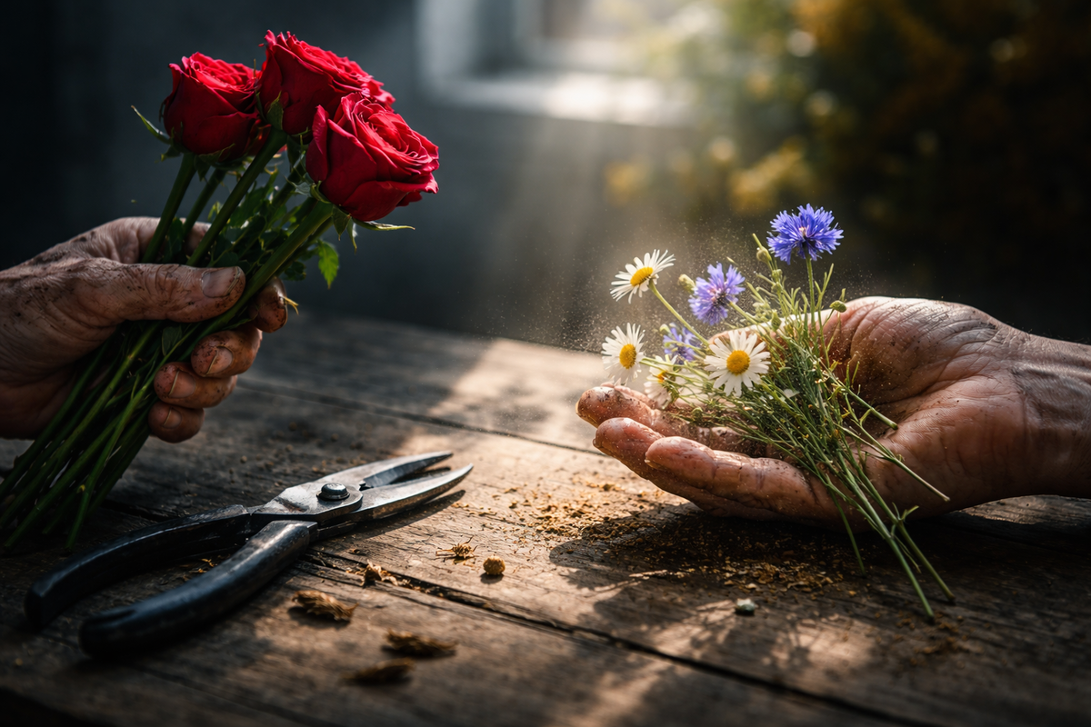 Знаете, я каждый день держу в руках совершенство. Оно приезжает ко мне в картонных коробках, плотно упакованное, охлаждённое и совершенно безжизненное. Голландские розы. У них стебли прямые, как карандаши, бутоны тугие, один к одному, и ни единого шипа. Селекционеры постарались на славу: убрали всё «лишнее». Только вот я заметила одну странную вещь: они почти не пахнут. Красивые? Безусловно. Живые? Не уверена. Они стоят в вазе неделями, не меняясь, а потом просто мумифицируются, так и не осыпав лепестки. Как пластиковые солдатики. И вот вчера, пока я подрезала эти идеальные стебли, по телевизору, который бубнит у меня в подсобке, рассказывали про «ножницы для ДНК». Про то, что скоро мы сможем вырезать из человека всё «неправильное» ещё до рождения. Учёный в белом халате с восторгом говорил, что мы победим болезни, а потом... потом сможем выбирать цвет глаз, рост, склонность к математике или музыке. Сможем создавать улучшенных людей. У меня внутри всё сжалось. Я посмотрела на свои руки,
