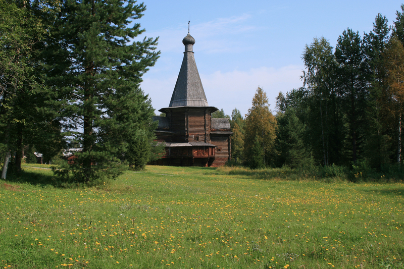 А теперь присмотритесь к галерее. Она не стоит на земле, а «парит» на выпусках брёвен из основного сруба. Это «висячая галерея» — архитектурный шик и признак высочайшего мастерства. На кровлях — изогнутые «бочки», покрытые лемехом, с которых не задерживается снег. Это не просто храм. Это деревянный небоскрёб XVII века, воплощение амбиций и богатства Подвинья. Покровитель — не Николай-спаситель на море, а Георгий Победоносец, покровитель хлеборобов. Здесь земля кормила щедро.