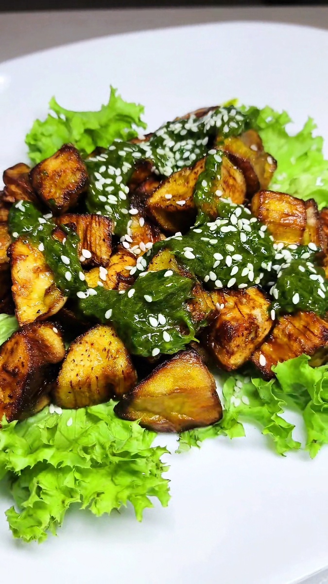 1. Баклажаны очистите от кожуры и нарежьте кубиками среднего размера. 2. Выложите нарезанные баклажаны на бумажные полотенца и тщательно промокните, чтобы убрать лишнюю влагу. 3. Переложите баклажаны в пакет или миску, добавьте крахмал, соль и перец. Хорошо перемешайте, чтобы каждый кусочек покрылся нашей смесью. (не переживайте если добавили много крахмала , лишний сам отпадёт, прилипнет столько, сколько нужно). 4. Разогрейте растительное масло в глубокой сковороде или сотейник и обжарьте баклажаны порциями до золотистой корочки и хрустящей текстуры . 5. Готовые баклажаны можете выложить в дуршлаг или на бумажные полотенца, чтобы убрать лишнее масло. 6. Для соуса возьмём нашу зелень, затем выдавливаем чеснок, растительное масло (или заправку для салатов) и измельчаем в блендере до однородной массы, можно как до так и после добавить соус терияки (или другой на ваше предпочтение). 7. Выложите баклажаны на тарелку, добавьте получившийся соус, перед подачей посыпьте салат
