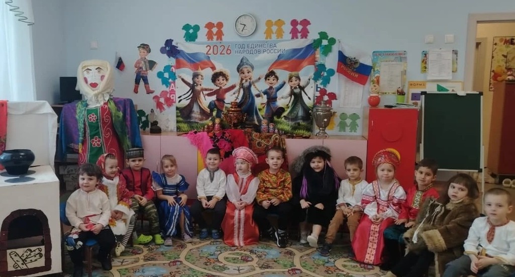 В группе «Звёздочки» Кашарского детского сада №1 «Тополёк» прошло праздничное мероприятие, посвящённое открытию в России 2026 года — Года единства народов. Этот год призван укрепить дружбу и взаимопонимание между всеми народами нашей страны, показать миру богатство культур, традиций и силу, которая рождается в единстве. Малыши пришли в нарядных народных костюмах, пели песни, танцевали и с интересом рассматривали предметы традиционного русского быта. Мероприятие подготовили и провели воспитатель Е.А. Полищук и тьютор И.Ф. Степанюк. Так юные кашарцы вместе со всей страной сделали первый шаг к большому и важному году — году дружбы, уважения и общих ценностей.