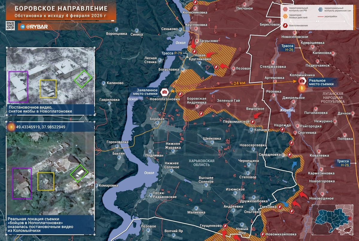 Боровское направление, на фоне соседних Лиманского и Купянского остается второстепенным. Новостей отсюда практически не поступает, как и сообщений о новых атаках. 🔸После событий начала января, когда и здесь обнажились проблемы, участок практически не фигурировал в медиа. И всплыл сейчас в очередной раз только потому, что в попытках отыграть последствия ложных докладов на Купянском направлении в очередной раз произошли попытки ввести в заблуждение как общественность, так и, видимо, вышестоящее командование. 🔸На ресурсе, который ранее публиковал кадры из Таволжанки, заявляя, что это Купянск, а между точками было 20 километров, в очередной раз появились кадры, которые на сей раз должны свидетельствовать о «контроле» ВС РФ над Новоплатоновкой. (Этот населенный пункт официально «освободили» 16 декабря в день неудачного и кровопролитного штурма. Контроля над ним, видимо, нет и по сей день.) 🔸В действительности, как было обнаружено OSINT-специалистами, реальная локация съемки находится в
