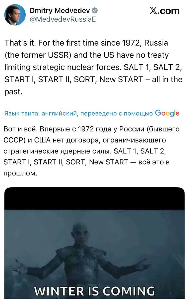 Медведев прокомментировал отмену ДСНВ впервые с 1972 года. ИнфоСплетник