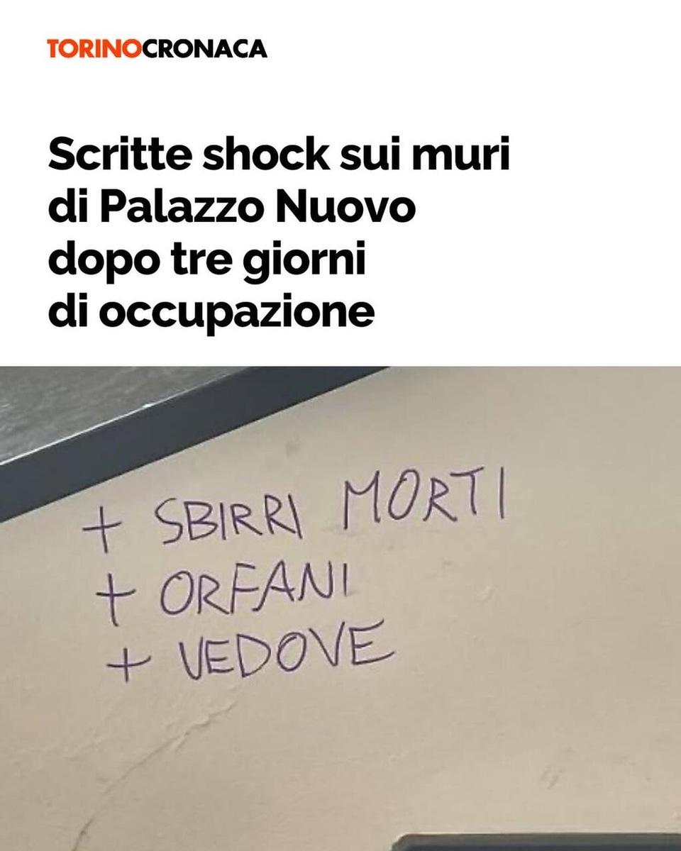 ✅ СПРАВКА: Эта новость переведена и размещена при помощи искусственного интеллекта Chat GPT без участия человека, в случае если вы заметили ошибку, или новость не соответствует реальному событию — сигнализируйте, исправим. 👉 Искренне Ваш Сержио Боттичелли: https://www.facebook.com/mercator.cz __________________ После трех дней оккупации, Палаццо Нуво, место расположения гуманитарных факультетов Туринского университета, снова открылось в понедельник, 2 февраля. Здание было занято антагонистическими группами с четверга в ожидании демонстрации за выселение Аскадасуны в субботу, 31 января. Некоторые активисты ночевали незаконно внутри здания, оставив множество надписей на стенах, включая оскорбительные фразы, такие как «Смешанные фритто сионисты и стражи порядка», «Дигос, палач» и «+ мертвых стражей порядка, + сирот, + вдов». Оцененные ущербы составляют около 40 тысяч евро и включают работы по покраске, восстановление отключенной системы видеонаблюдения, ремонт засоренных туалетов, а т