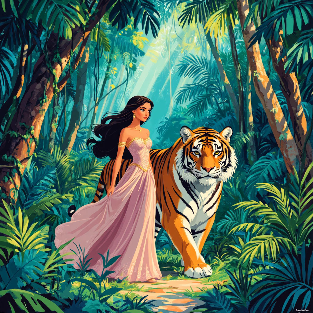 И вдруг — шорох, рычание, блеск янтарных глаз. Из зарослей вышел тигр. Огромный, с шерстью, переливающейся, как мёд в лучах заката. Принцесса замерла, но страх быстро сменился удивлением: тигр не напал. Он смотрел на неё… почти ласково.