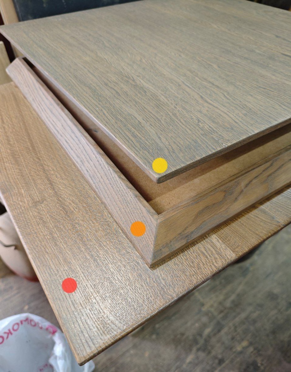 На фотографии представлены столешницы из дуба, тонировка нанесена одинаковая, финишный слой ПУ лак. 🔴 Новая столешница. Тонировка и лакировка пару дней назад 🟠 Старая столешница (примерно 6 месяцев) нижняя сторона, которая не так явно подвергалась солнечному свету и механическому воздействию 🟡 Старая столешница лицевая поверхность Тут видно, что лицевая сторона столешницы, которая полгода простояла в ресторане имеет отличный от новой оттенок. Это нормальный процесс.